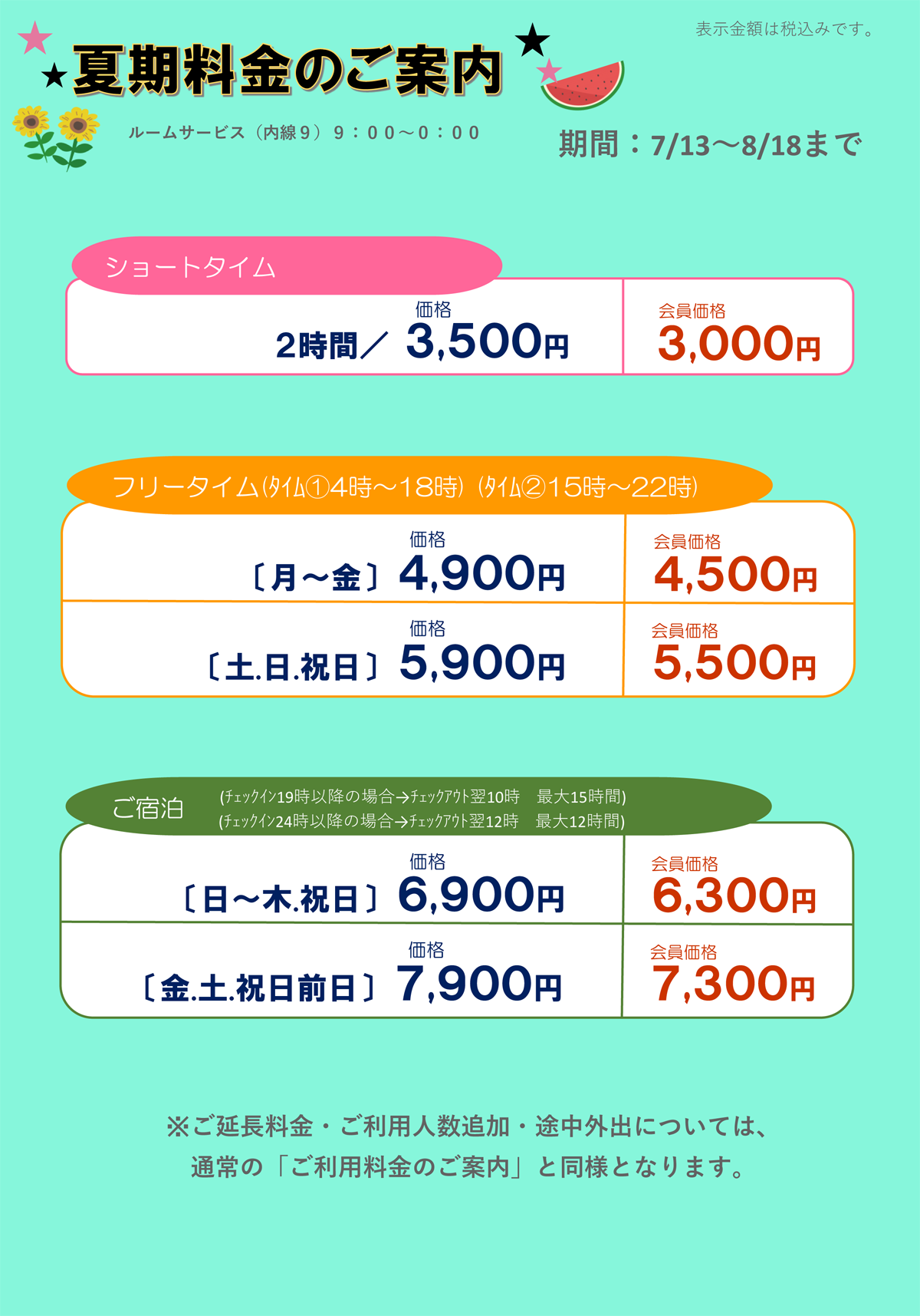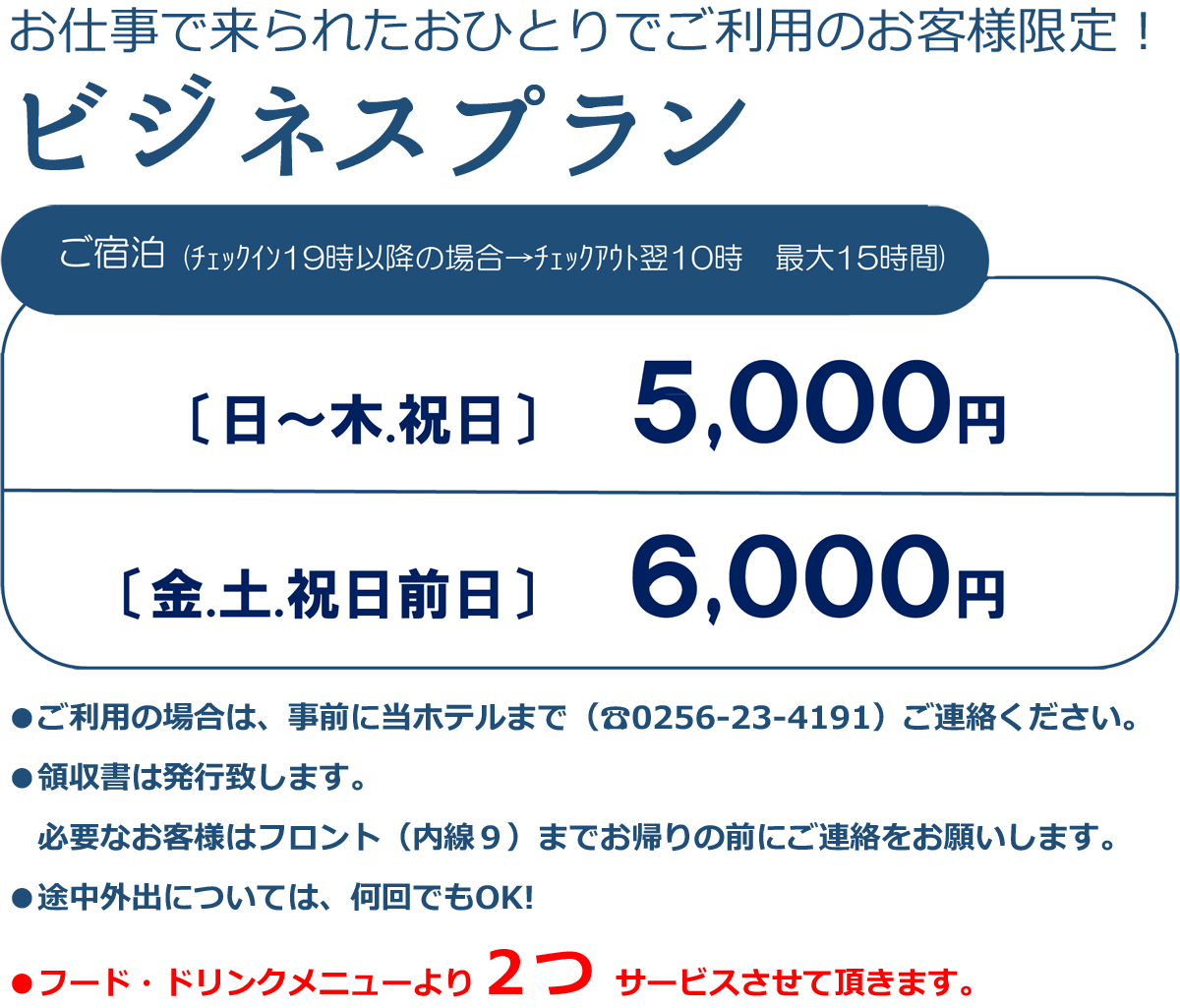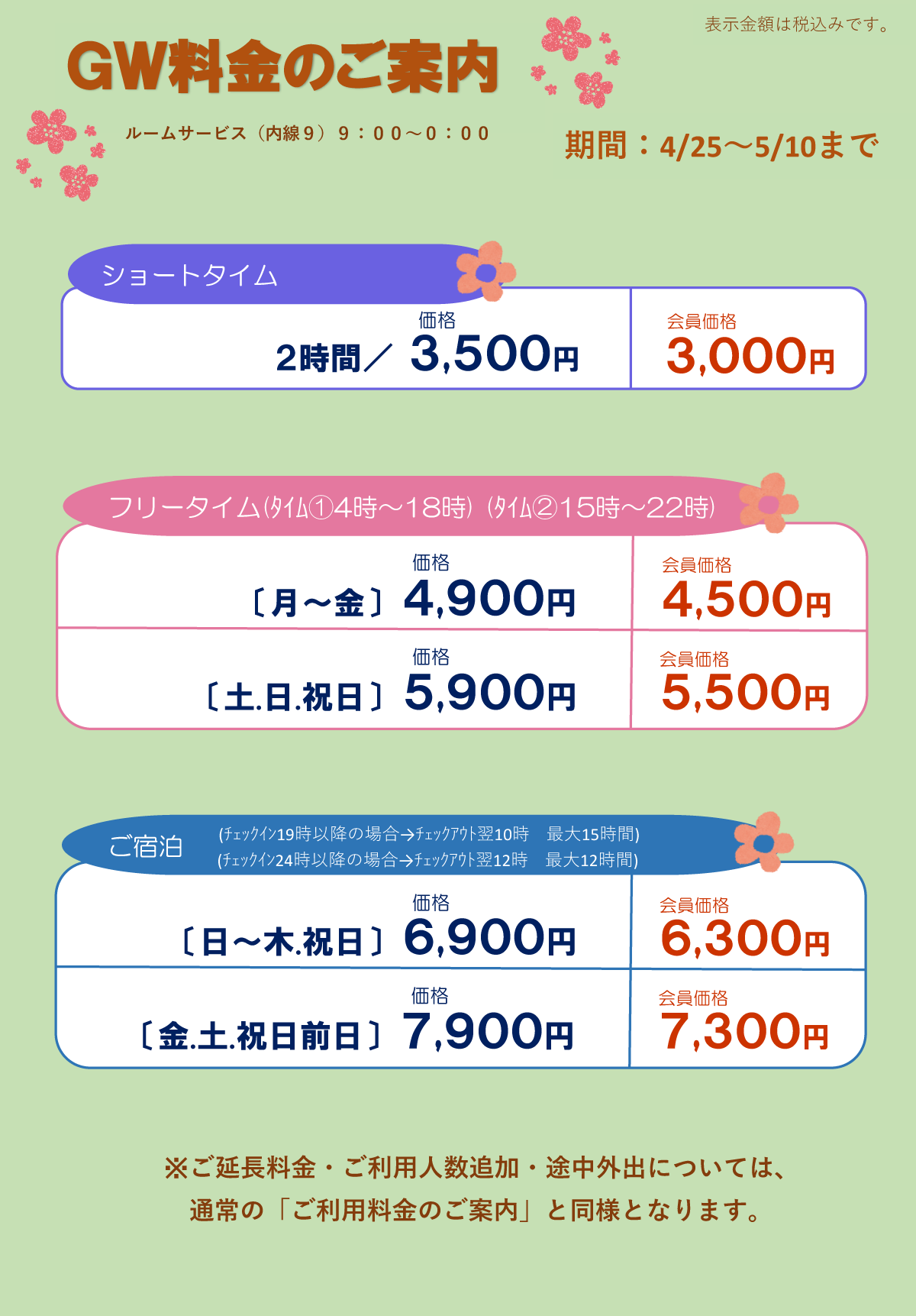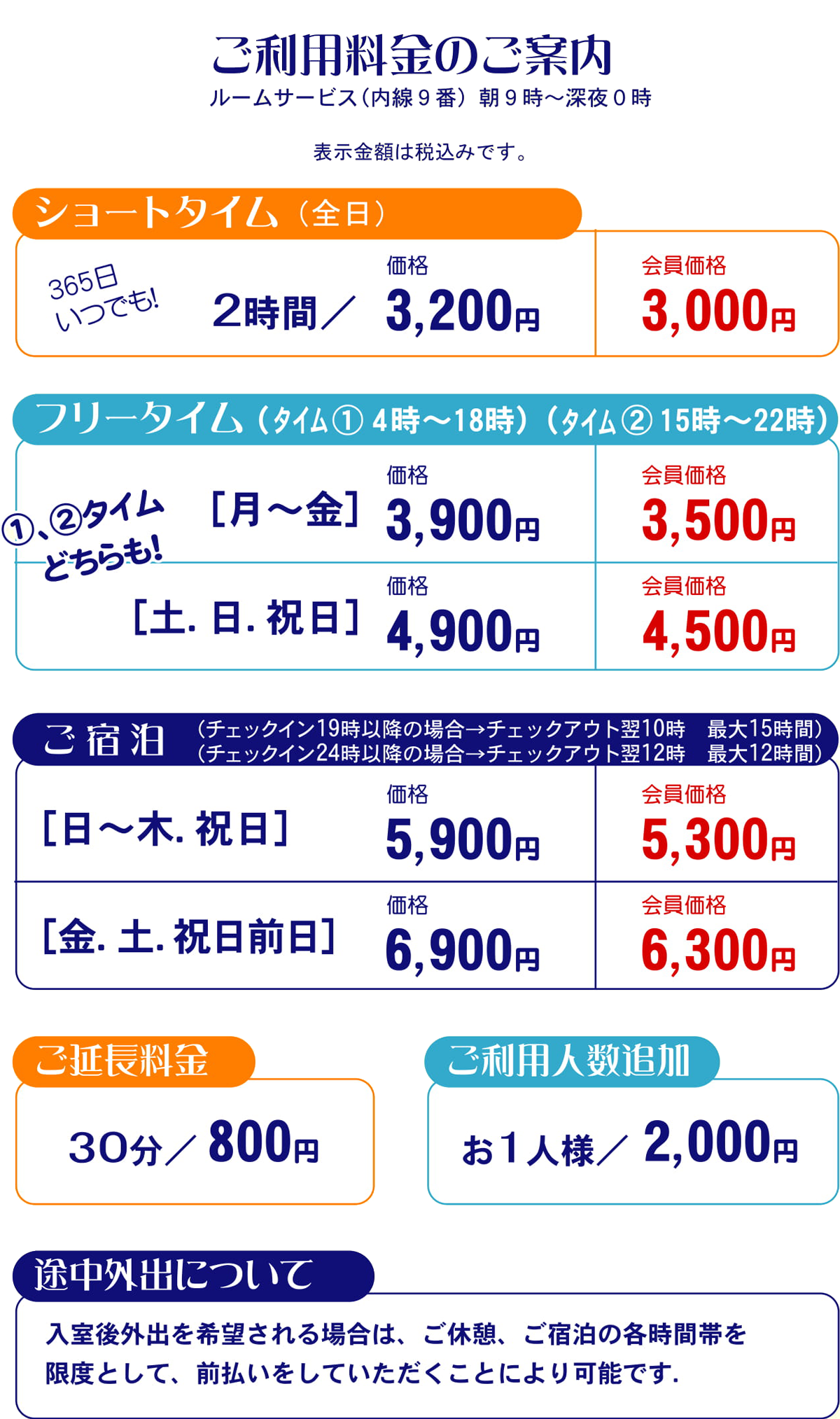 - 入室後、外出ご希望の場合は、前払い料金をお支払いただくことで可能です (フロントへご連絡下さい)